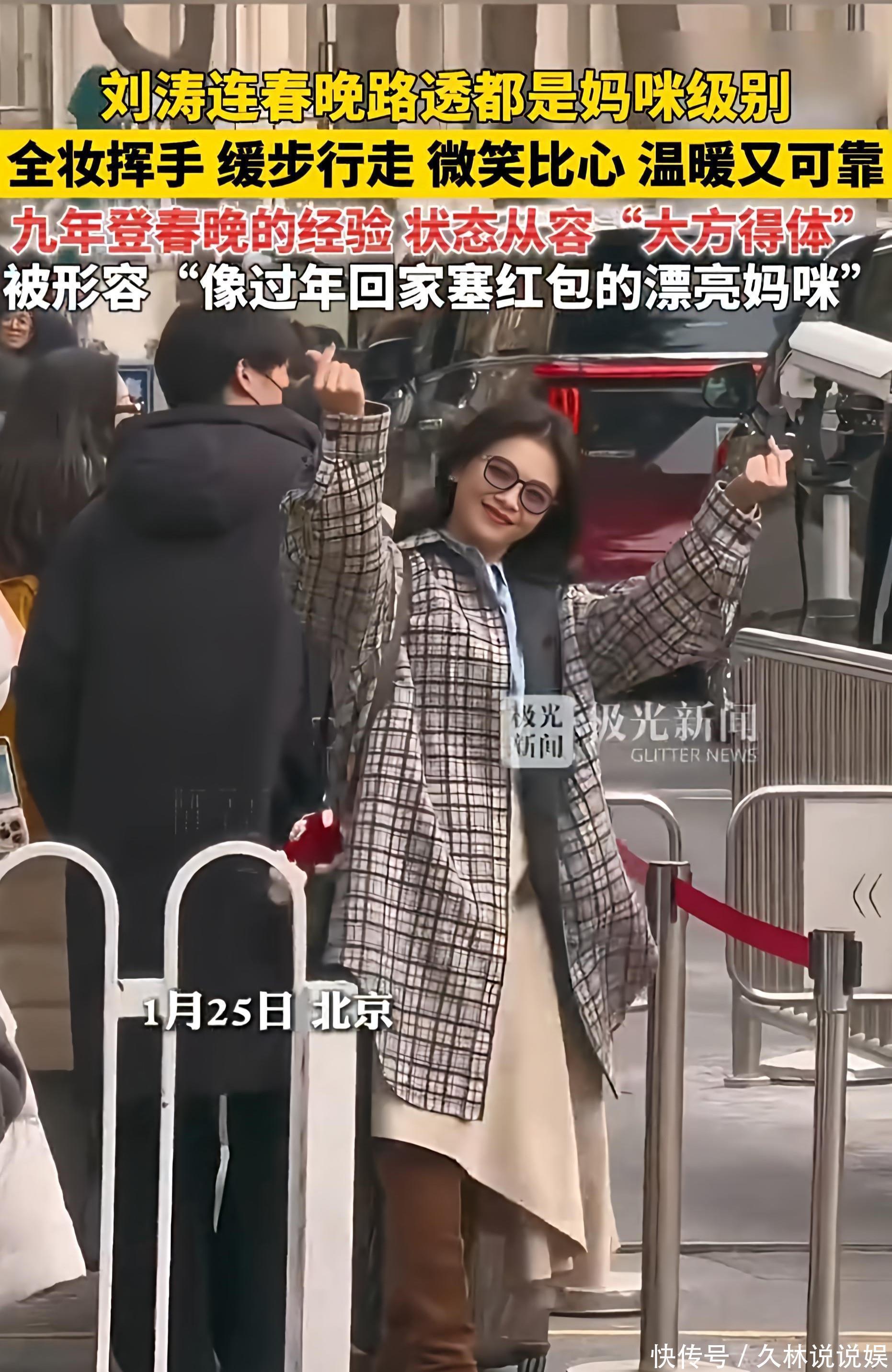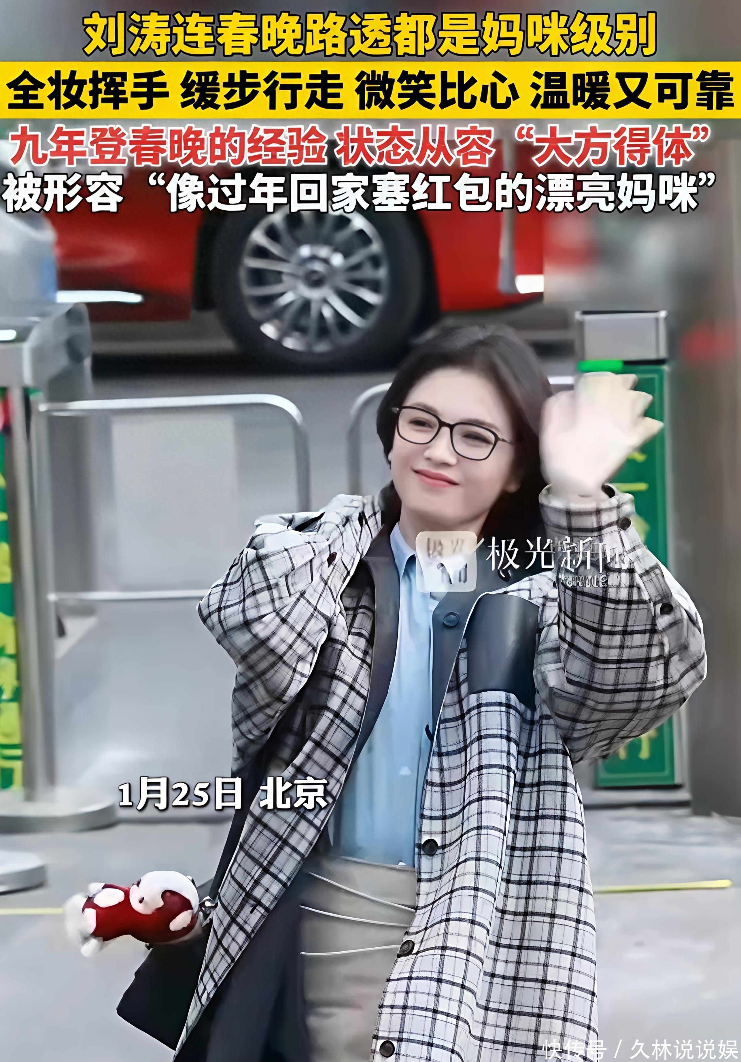 2026年1月25日,刘涛在北京参与央视春晚二次联排,现场路透图和短视频流出,当晚便引爆网络。 1月25日,刘涛在北京春晚联排现场,身着复古格纹大衣搭配金属框眼镜和卷发,与执勤民警合影,还主动和粉丝、小朋友亲和互动,全程无明星架子,和民警的合影路透图更是全网刷屏。